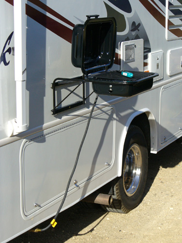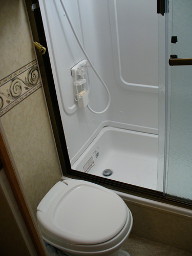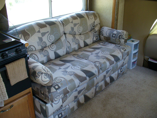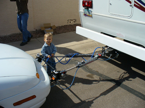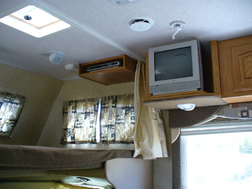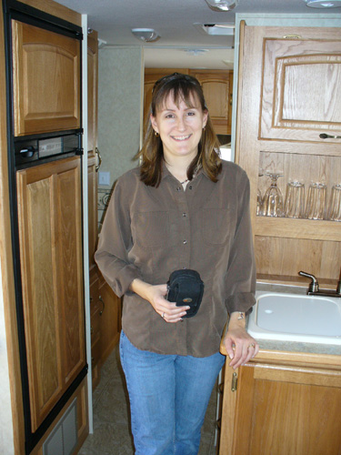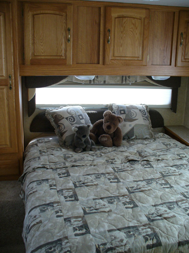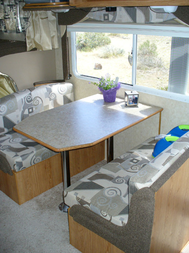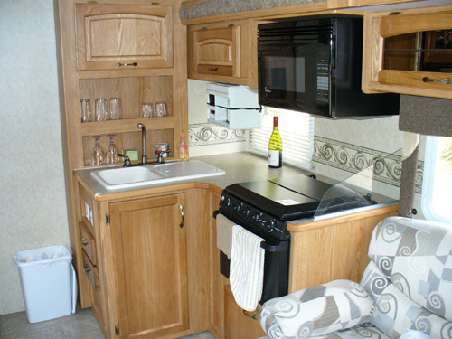 Our new home is a Jayco Greyhawk 29GS. This is a Class C motor home that will sleep up to 8 people. It is 30-feet long, has a queen-size bed in the back, a queen-size cabover sleeping area, and has a couch and dinette that convert into sleeping areas. The couch and kitchen are in a slide-out that gives us extra room when we're camping. There is plenty of storage for clothes and Justin's toys inside, and plenty of storage outside for climbing gear, tools, our RV-mounted grill and more of Justin's toys. We have a tow bar and supplemental braking system for towing the Saturn. So far, it has proven to be a very effective and comfortable setup for our life on the road.
